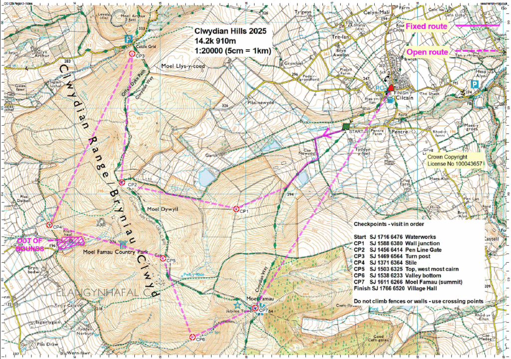After going round the houses several times, the planned major revision has ended with a minor revision – guess goes to show what a good route it is when I struggle to amend it. CP1-Cp3 remains. CP4 is new which should make for a few interesting lines up to Moel Dywyll. Route from there is ‘standard’ except you now head straight for the village hall from the summit – so good sharp descent from the top down the old Mountain Race zig-zags.